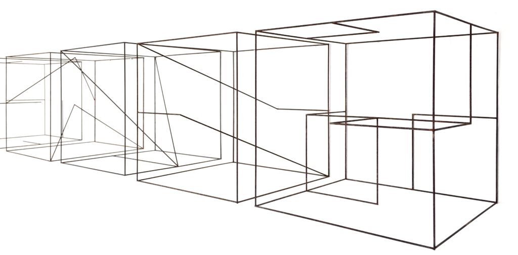 The extra lines within the open cubes are like a spatial script based on three-dimensional geometric shapes.